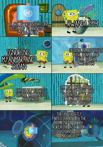 I had thought and interpreted that the UN or US flag being used in the first panel wouldn’t have made a difference but then I remembered someone could absolutely try to diminish the US’s (and really the collective West’s) role in perpetually balkanizing and destabilizing the Global South by dispersing the blame equally to each member state of the UN (both-sidesing/all-sidesing/whatever-the-fuck-it’s-called)…