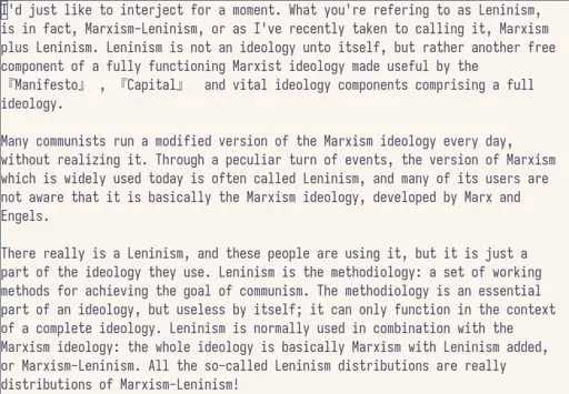 I’d just like to interject for a moment. What you’re referring to as Leninism, is in fact, Marxism-Leninism, or as I’ve recently taken to calling it, Marxism plus Leninism. Leninism is not an ideology unto itself, but rather another free component of a fully functioning Marxist ideology made useful by the 『Manifesto』 , 『Capital』 and vital ideology components comprising a full ideology.