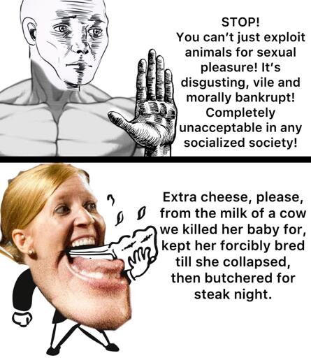 The title is a joke. Playing on the typical ‘smh vegans blah blah blah’ and the wanting to fuck animals part of the top of the meme.