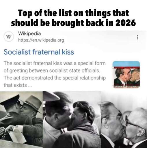 minus-squareMaeve@kbin.earthlinkfedilinkarrow-up4·4 days agohttp://2.bp.blogspot.com/-PAzPri0MCw8/UzDpRQHnAZI/AAAAAAAAI2I/BgAMUiWWPd4/s1600/The+Socialist+Fraternal+Kiss+between+Leonid+Brezhnev+and+Erich+Honecker+1979.jpg https://www.rferl.org/a/the-soviet-kiss-gone-but-not-missed/29161360.html