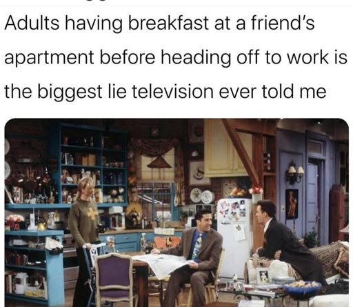 That and having time to hang out at the coffee shop all the time. And also Monica who supposedly works in a high end restaurant having as much time as she does to socialize and whatnot. Still love the show tho.