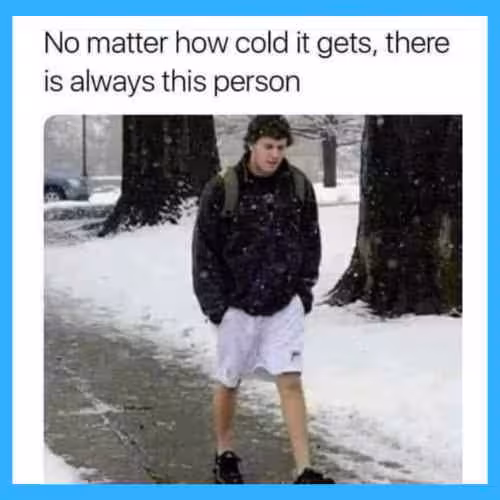 I was this guy when i lived in hungary but the funny part was that it was actually like 10c and spring(even tho historically it used to go below minus 10 there during winter). Now that i live in sweden i realize people are also like that here but thankfully the large amount of finns who live here spice it up. Im not even kidding when it was my first winter here and a guy showed up in shorts in -20c while i had two hoodies and a winter jacket on and was still freezing. Always the finns.