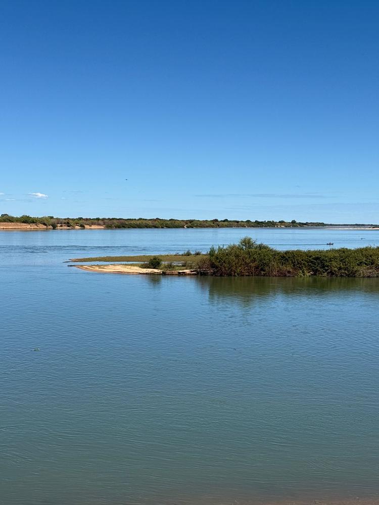 Imagem de capa : paisagem do Cerrado com um largo rio em destaque, um pouco de vegetação baixa nas margens e boa parte do céu amostra.