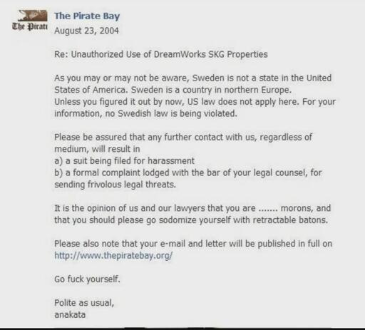 arrow-up14arrow-down1image20 years ago, Pirate Bay's response to legal threats from DreamWorkssh.itjust.worksalphacyberranger@sh.itjust.works to Piracy: ꜱᴀɪʟ ᴛʜᴇ ʜɪɢʜ ꜱᴇᴀꜱ@lemmy.dbzer0.comEnglish · 1 year agomessage-square0linkfedilink