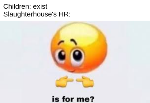 arrow-up10arrow-down1imageSlaughterhouses 🤝 Child Laborplus-squarei.imgur.comusernamesAreTricky@lemmy.ml to Memes@lemmy.mlEnglish · 3 years agomessage-square0linkfedilink